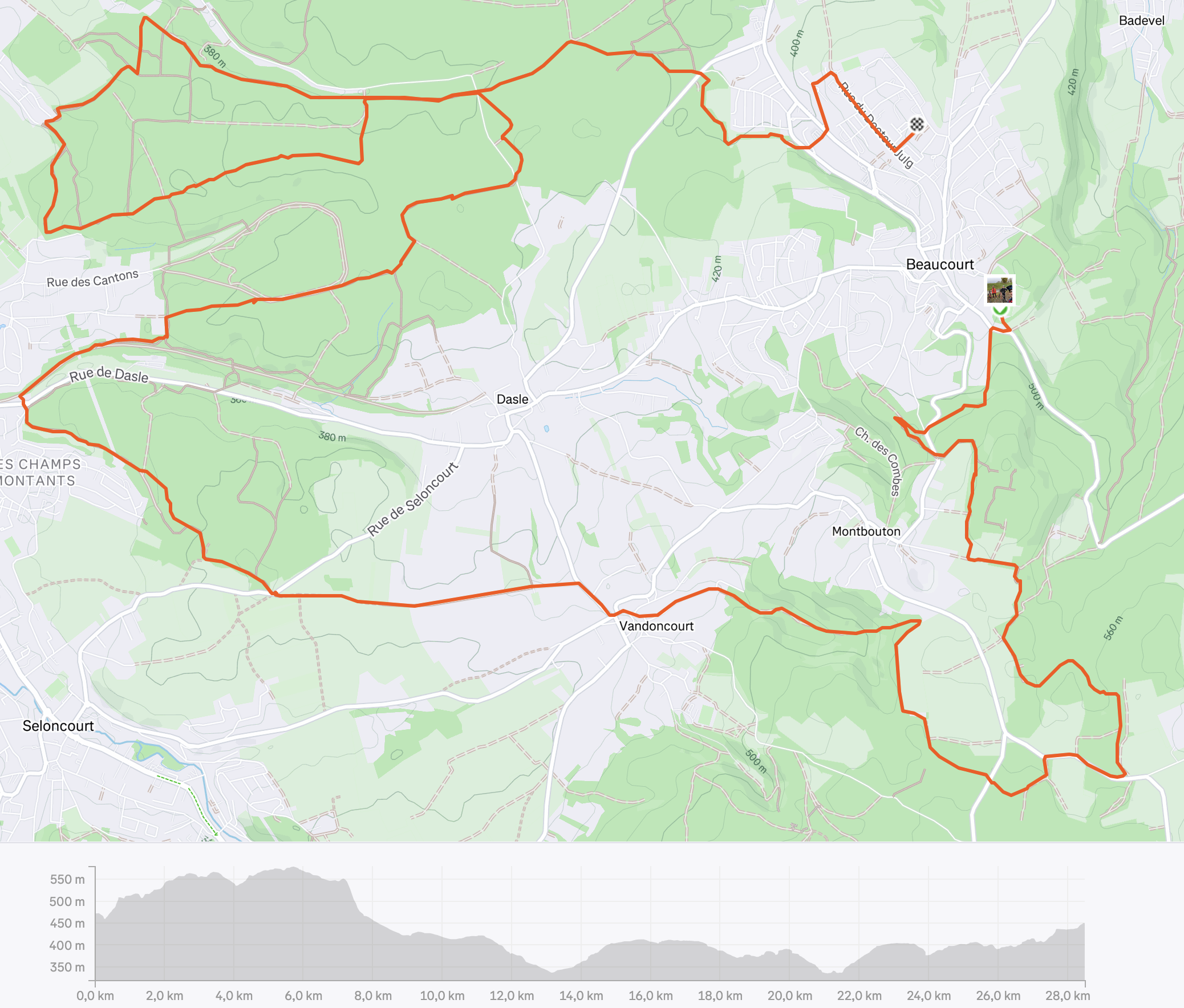 Jusqu’à Audincourt, c’est tout de même une variante de la semaine précédente. Ensuite il y a innovation. Ils rentrent dans le bois vers le vita d’Audincourt et remontent jusqu’au vita de Dasles, slalomant gaiement entre les arbustes vraiment très très proches. Vont-ils rentrer alors que la pluie commence à tomber?