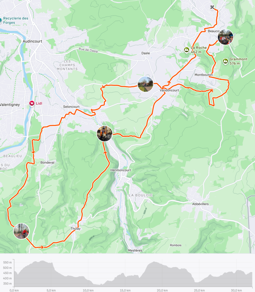 Les derniers sont déjà là, alors pas de temps à perdre, direction Montbouton. Ils évitent soigneusement les sentiers jusqu’après le Grammont et ensuite se signent devant la Croix sur la route de la ville du même nom. Après le tour de la pâture qui les ramène à Montbouton, Gaël pique vers Vandoncourt;