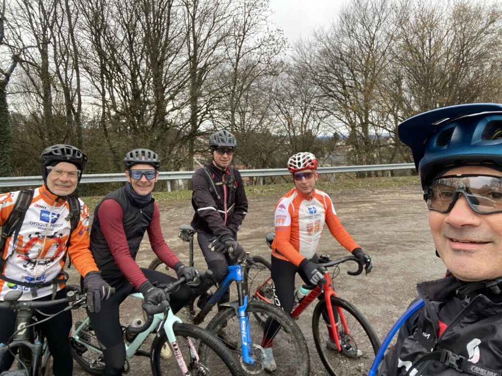 3 VTTistes et 1 gravel (Julien), quand Eric fait son apparition en … route. Pas motivé, pas envie de se salir, pas ceci, pas celà, gna gna gna… Et impossible de lui faire changer d’avis.