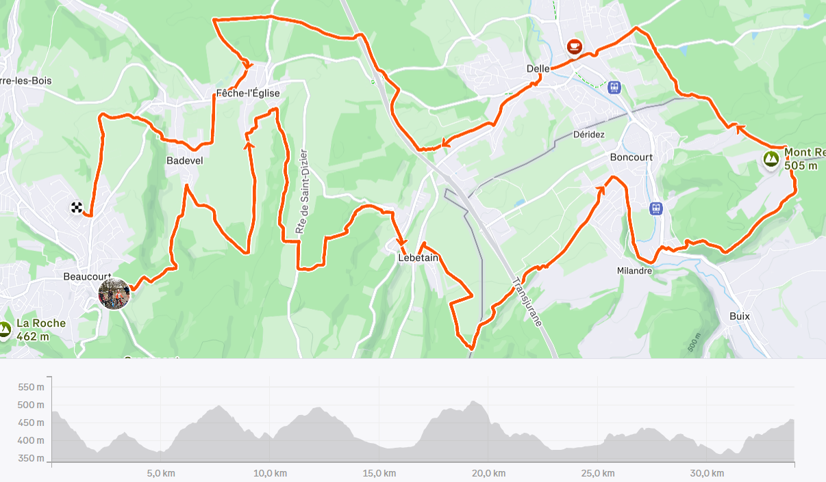 Après la descente ils rejoignent Delle, passent par le centre ville, puis roulent en direction de Lebetain. Ils font encore découvrir un sentier à Julien, alors que le soleil apparaît.