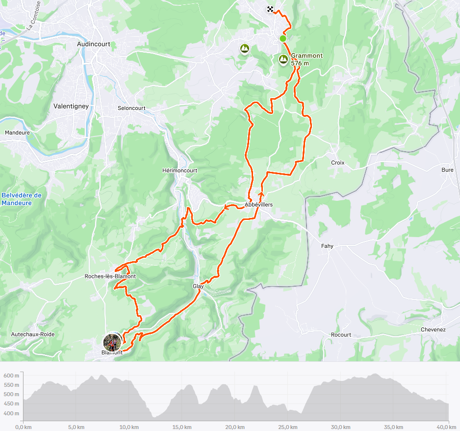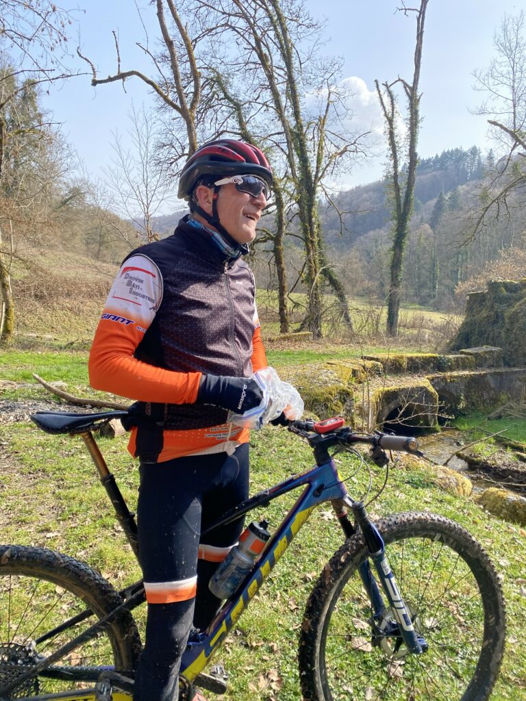 A Abbevillers Francis tente bien d’amadouer l’équipe par un apéro en terrasse mais l’heure avancée convainc de rentrer. Laurent seul par Vandoncourt, les autres ensemble par le « KOM à Dorian ». Un arbre barre le sentier, et pour un autre Eric fait le ménage pour la prochaine fois.
